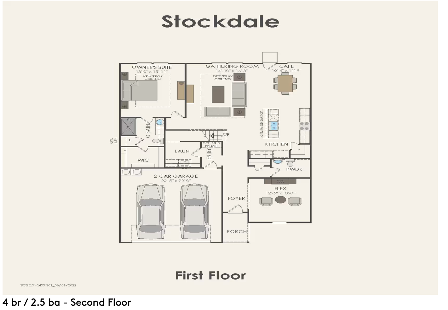 The first floor showcases an open-concept kitchen, café-style dining area, and spacious gathering room, ideal for everyday living and entertaining. The kitchen includes ample cabinet space, a large island, and flows seamlessly into the main living areas. A convenient half bath and full laundry room are also located downstairs.